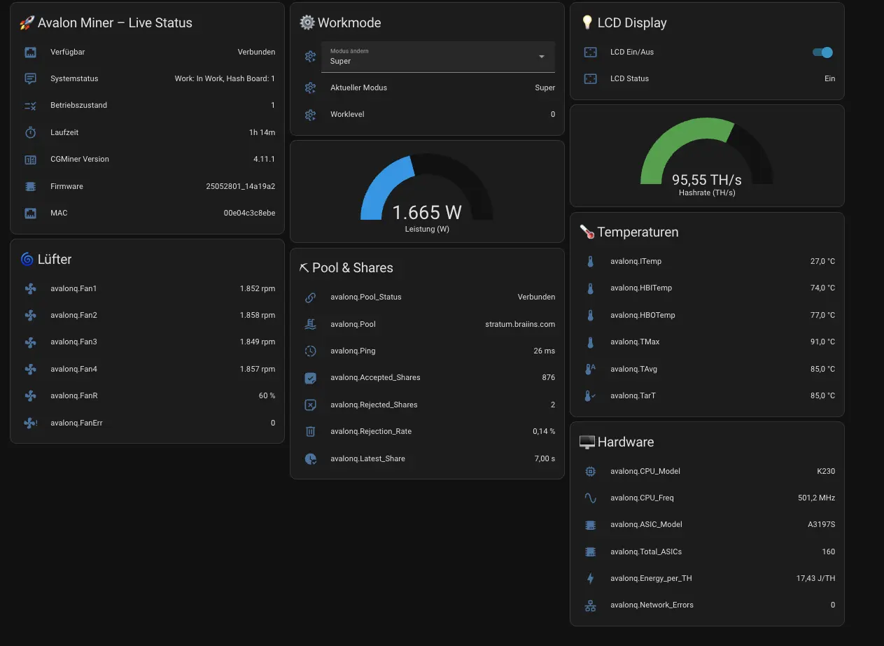 Dein AvalonQ Mining Dashboard ist nun vollständig eingerichtet und zeigt alle relevanten Live-Daten übersichtlich an. Du kannst den Miner jetzt überwachen, steuern und Automationen darauf aufbauen.