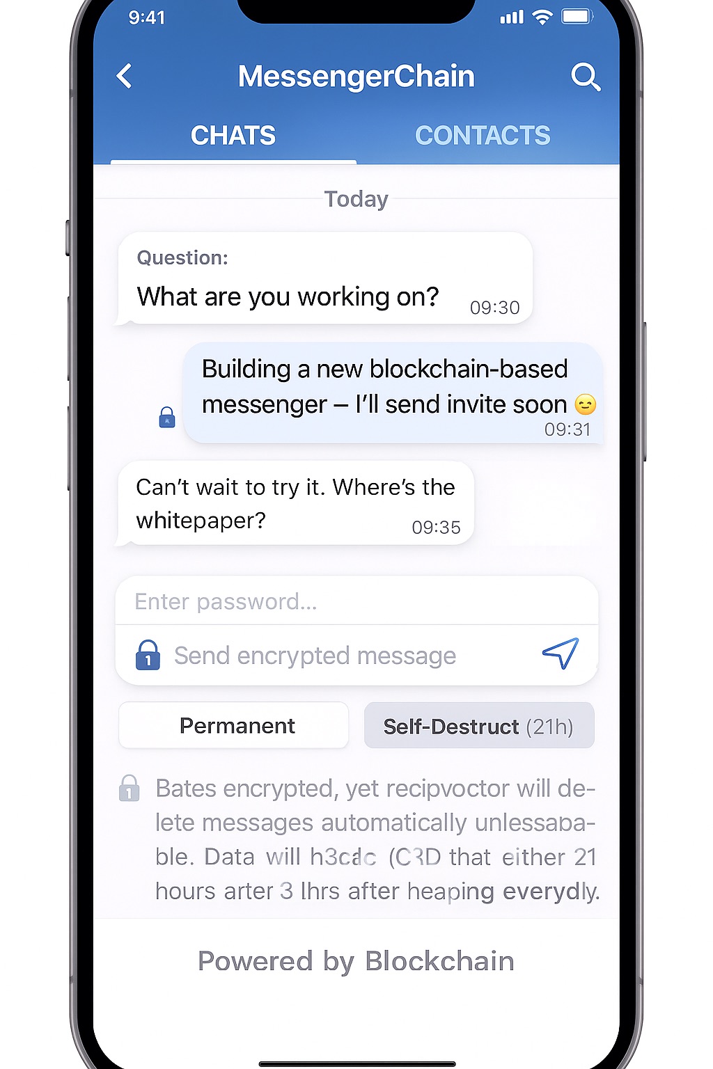 Die MessengerChain-App zeigt verschlüsselte Nachrichten in Echtzeit an, sobald sie im Mempool landen. Sie benötigt keinerlei Benutzerkonto oder Telefonnummer – alles basiert ausschließlich auf Public/Private Keys.